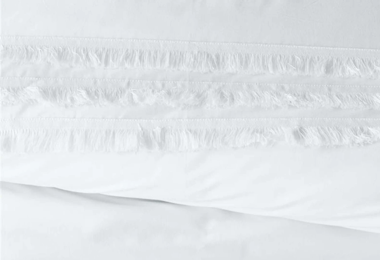 Die Bettwäsche La Ruche ist eine kühle weiße Bettwäsche. Sie sieht elegant und luxuriös aus, hat aber durch die Fransen auf Bettbezug und Kissenbezügen auch Boho-Chic. Sowohl auf dem Bettbezug als auch auf den Kissenbezügen sind drei Streifen mit Fransen zu finden, die mit einem schönen Band befestigt sind. Das gestickte Logo von Rivièra Maison rundet den Bettbezug stilvoll ab. Die Bettwäsche ist aus hochwertiger reiner Baumwolle, 144 TC, gefertigt. Baumwolle ist ein atmungsaktives und feuchtigkeitsaufnehmendes Naturprodukt. Die Bettwäsche fühlt sich durch die spezielle Verarbeitung komfortabel und angenehm weich an. Der Bettbezug ist mit einem Reißverschluss ausgestattet.