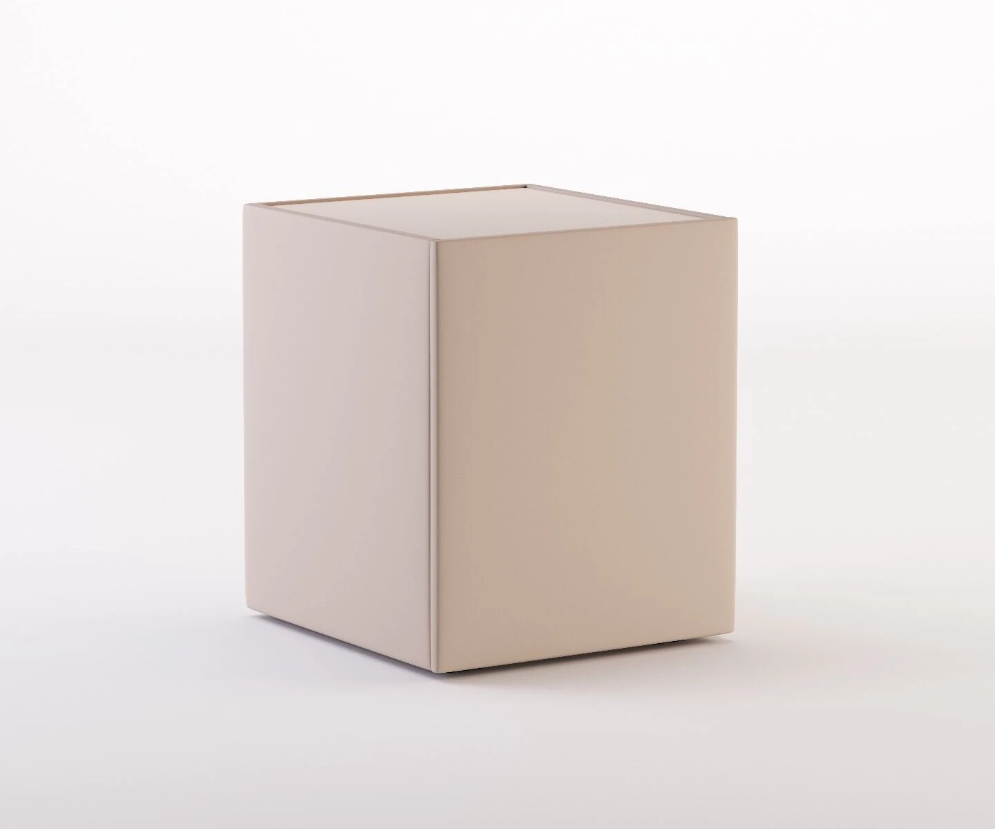 Die gesamte Vorderseite dieses Nachttischs besteht aus einer gepolsterten Schubladenfront mit einer großen Schublade. Hinter dieser Front befindet sich eine zweite, zusätzliche Schublade, die mit einem Push-to-Open-System ausgestattet ist. Ein leichter Druck auf diese Schublade bewirkt das Öffnen der Schublade, sodass bei diesem Nachttisch keine Handgriffe benötigt werden