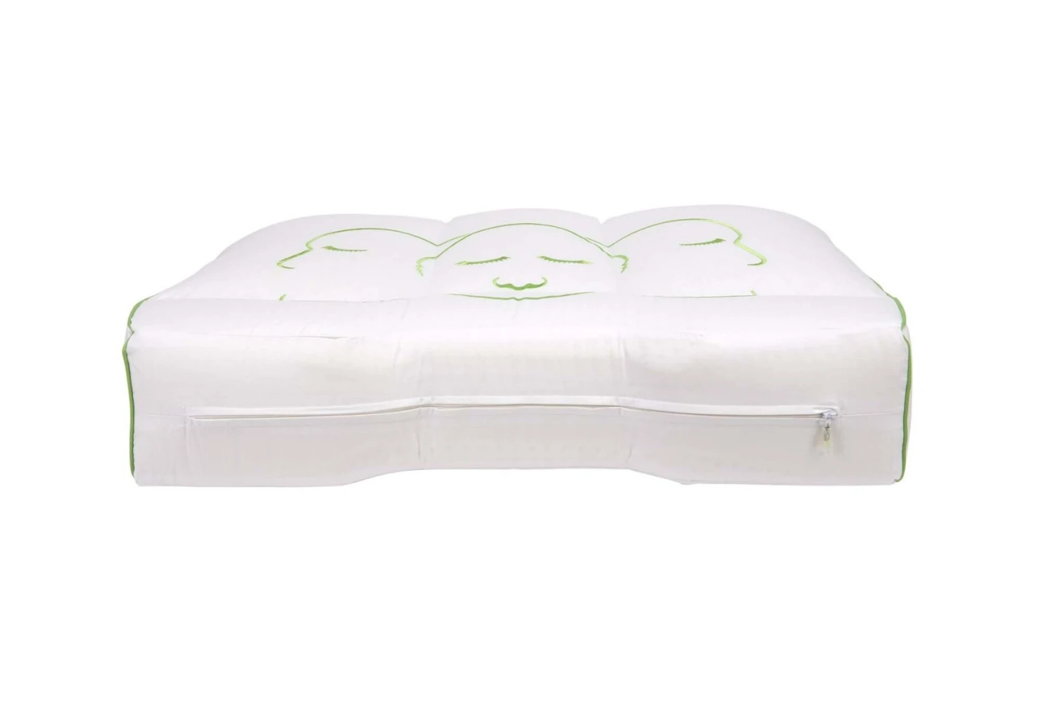 Der Bezug des Kissens ist aus 100% hochwertiger Baumwolle und ist gegen Hausstaubmilben behandelt. Rundum ist der Bezug mit einer grünen, gestickten Biese abgesetzt. Das Kissen verfügt über eine vorgeformte Schulterkontur sowie eine Nackenstütze.