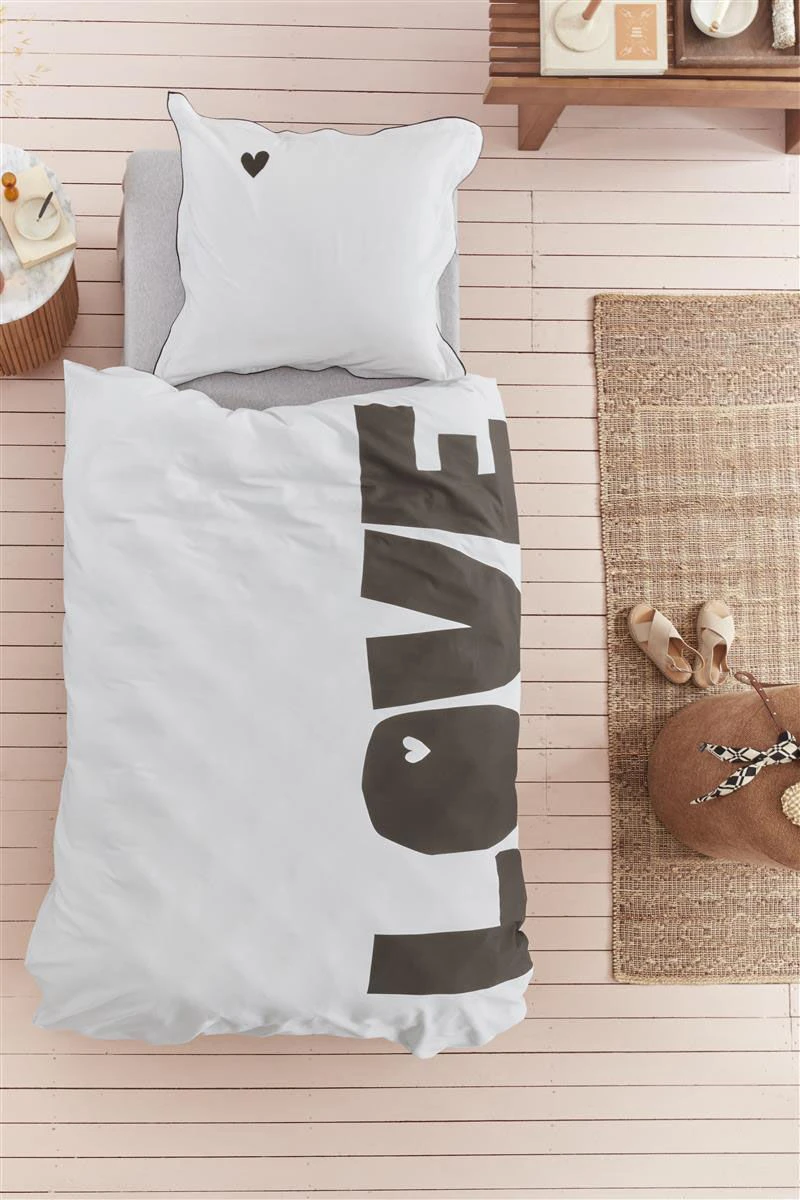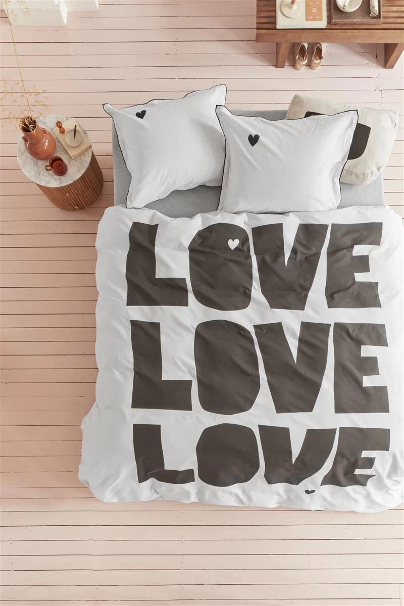 Feiern Sie die Liebe mit dem Bettbezug Bold Love von vtwonen. Dieser Bezug ist aus 100% hochwertiger Baumwolle gefertigt und zeigt sowohl auf der Vorder- als auch auf der Rückseite das Wort „Love“ in Dunkelbraun auf einem cremefarbenen Hintergrund. Das vtwonen-Herz rundet den Bettbezug perfekt ab und findet sich auch auf den Kissenbezügen wieder. Die Kissenbezüge sind an den Rändern mit einer dunkelbraunen Overlock versehen, die den Text auf dem Bettbezug ergänzt. Das Wort “Love“ ist auf dem Bettbezug in der Einzelgröße vertikal gedruckt, während es auf den anderen Größen horizontal gedruckt ist.
